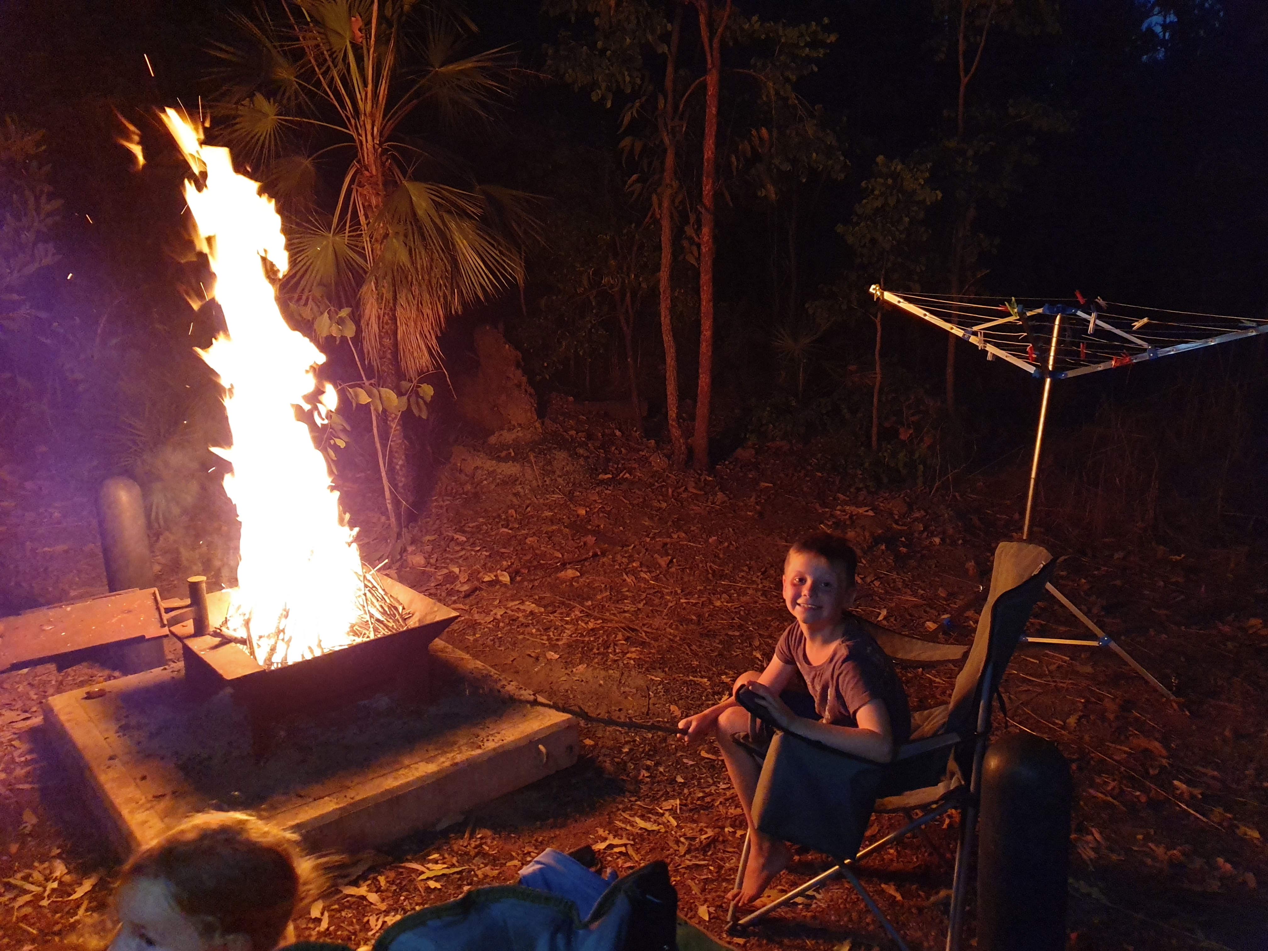 Finally reached the bitumen at Roper Bar and decided to try to get all the way to Mataranka which was 180km and we had just over a quarter tank. The car trip computer saying that we could comfortably make it. As we found out it is woefully inaccurate. We stopped to re-inflate the tyres on car and van before starting. Initially we seemed to be doing fine at 100kph, but it soon became apparent that this was not quite as comfortable as we thought. We slowed to 80, then 60kph, turned off the phone chargers and the air conditioning (had to open the windows). Thought about stopping the kids DVD, but decided I would rather run out of fuel. Considered stopping for the night at roadside stop, but the first had been burnt out by a bush fire and then the next was pretty close to a further fire and no phone reception, so on we went. At 50km to go the fuel light came on and I had Edwina consulting the car manual to see how much the reserve was. By 30km to go the trip computer said our range was 0 and to refuel now. We crept into The first petrol station in Mataranka at 18.10pm in the twilight. We still had 7 litres remaining! By the time we found our site it was dark and well done to Edwina for directing me into the site in the dark in a very packed caravan park. A long day for all.